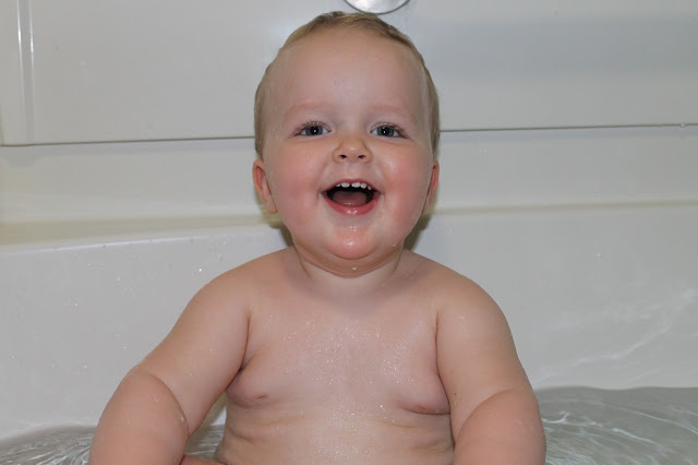 Like the way, in the bath tub, that he likes to FLOP! onto his belly and "swim" (read: splash mommy) and then sit up, only to FLOP! onto his back and talk out loud, enjoying the way the water muffles his own voice in his ears.