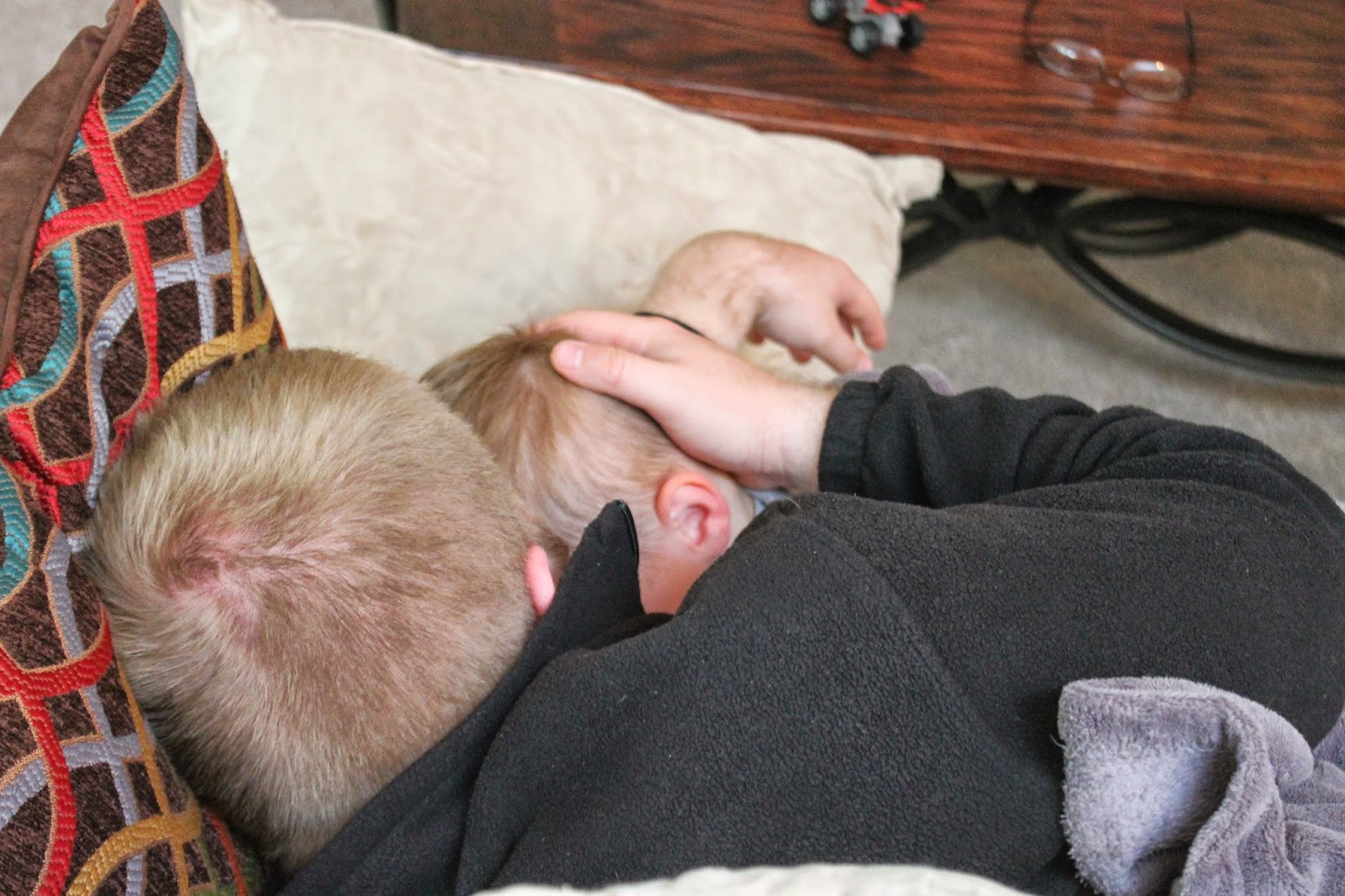 These sweet pictures are from Father's Day. Josh was napping on the couch and Wyatt crawled up and told Josh he wanted to sleep with him.