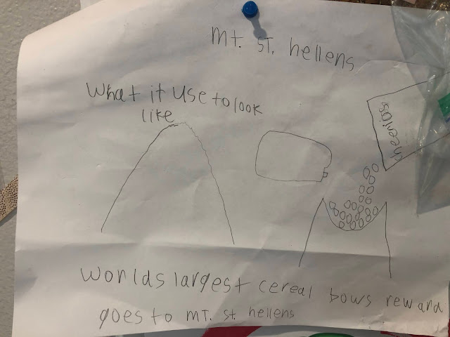 Laughing... at the picture Wyatt drew of Mt. St. Helens after we watched a special documentary (find it on Disney Plus- Surviving The Mount St. Helens Disaster) on it. He drew the before (a perfect mountain with a pretty little top) and the after (where he shows it as a bowl, with someone pouring cheerios & milk into it) and says, "World's Largest Cereal Bowl Reward Goes To Mt. St. Helens." Hah!!