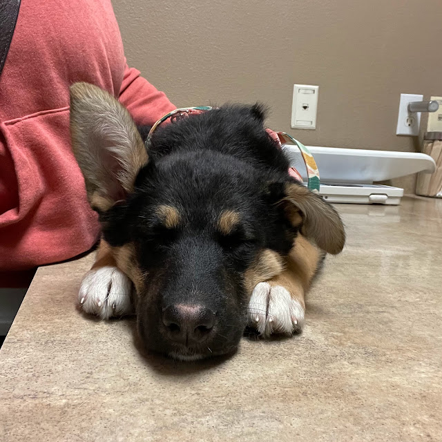 She was so sweet to the vet and his assistant's, just giving them kisses and wanting to be held by them. I am proud to report that she is potty trained, and only has a pee pad in her crate for night times. So awesome. She is still waking up a bit earlier than I would like, but I'm hoping that will improve.